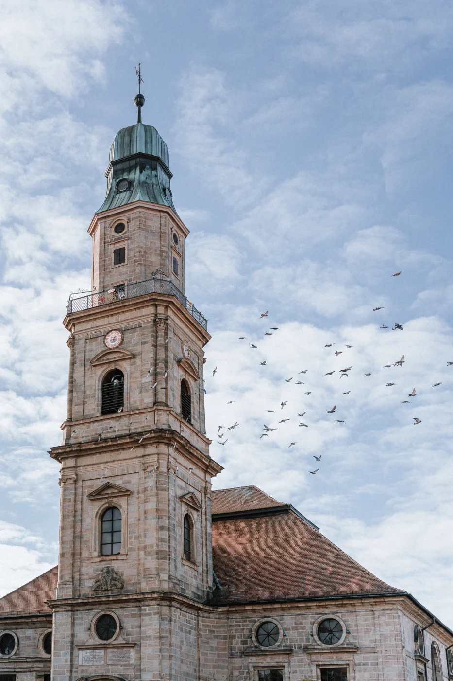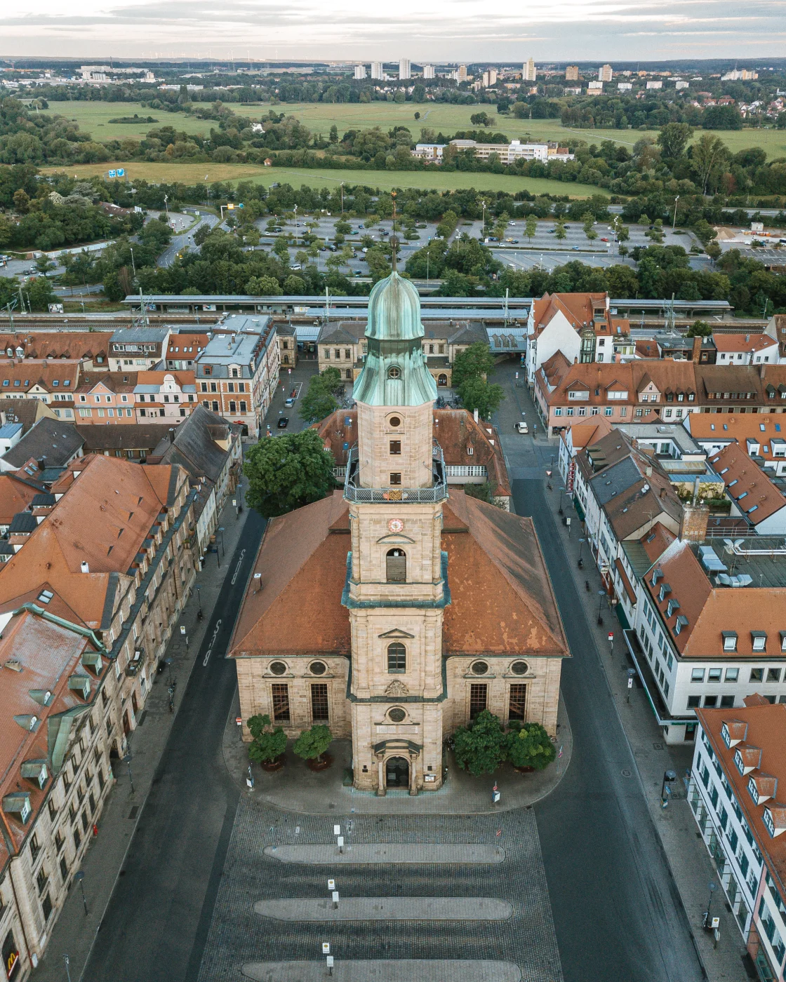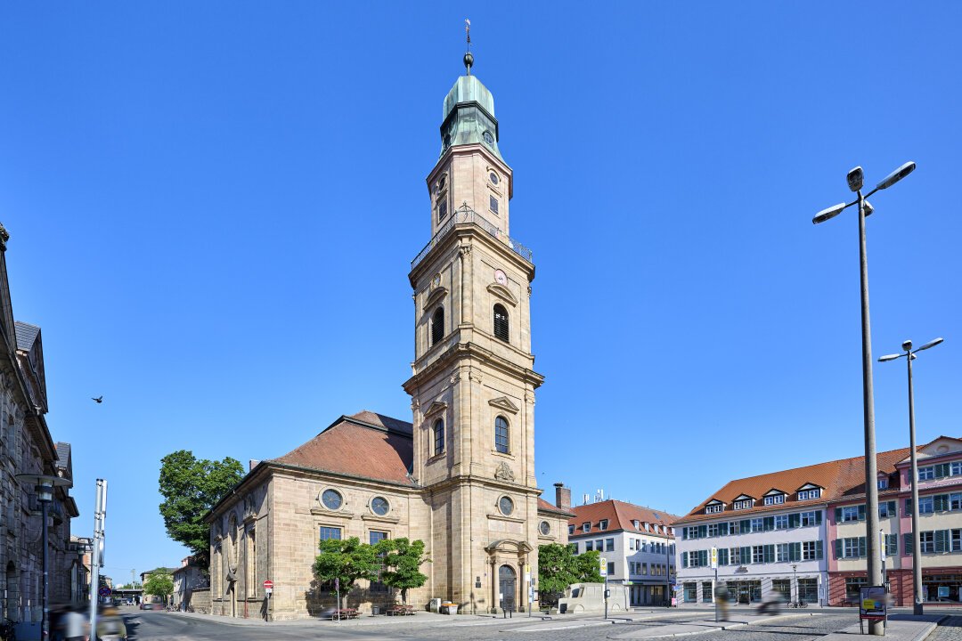 Die Kirche war ein Geschenk von Markgraf Christian Ernst und wurde zwischen 1686 und 1693 nach Plänen von Johann Moritz Richter in Erlangen erbaut. Mit der Grundsteinlegung am 14. Juli 1686 begann der Bau der Neustadt, der 52 m hohe Turm entstand erst 1732–36. Das Markgrafenpaar wohnte dem Gottesdienst in einer eigenen Loge bei. Besondere Beachtung verdienen die wertvolle Kanzel (1700) und die Barockorgel von Johann Nikolaus Ritter (1755–1764).