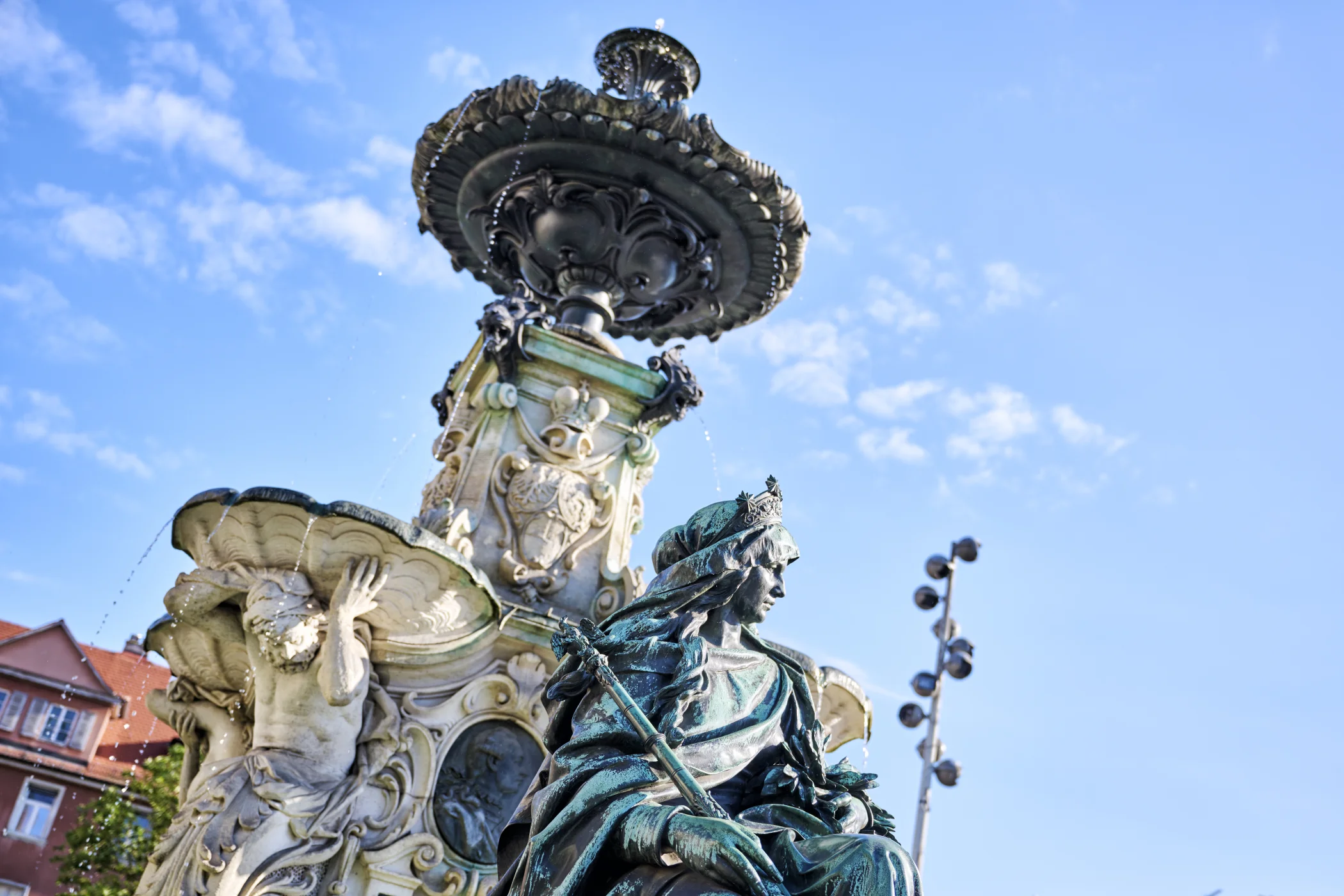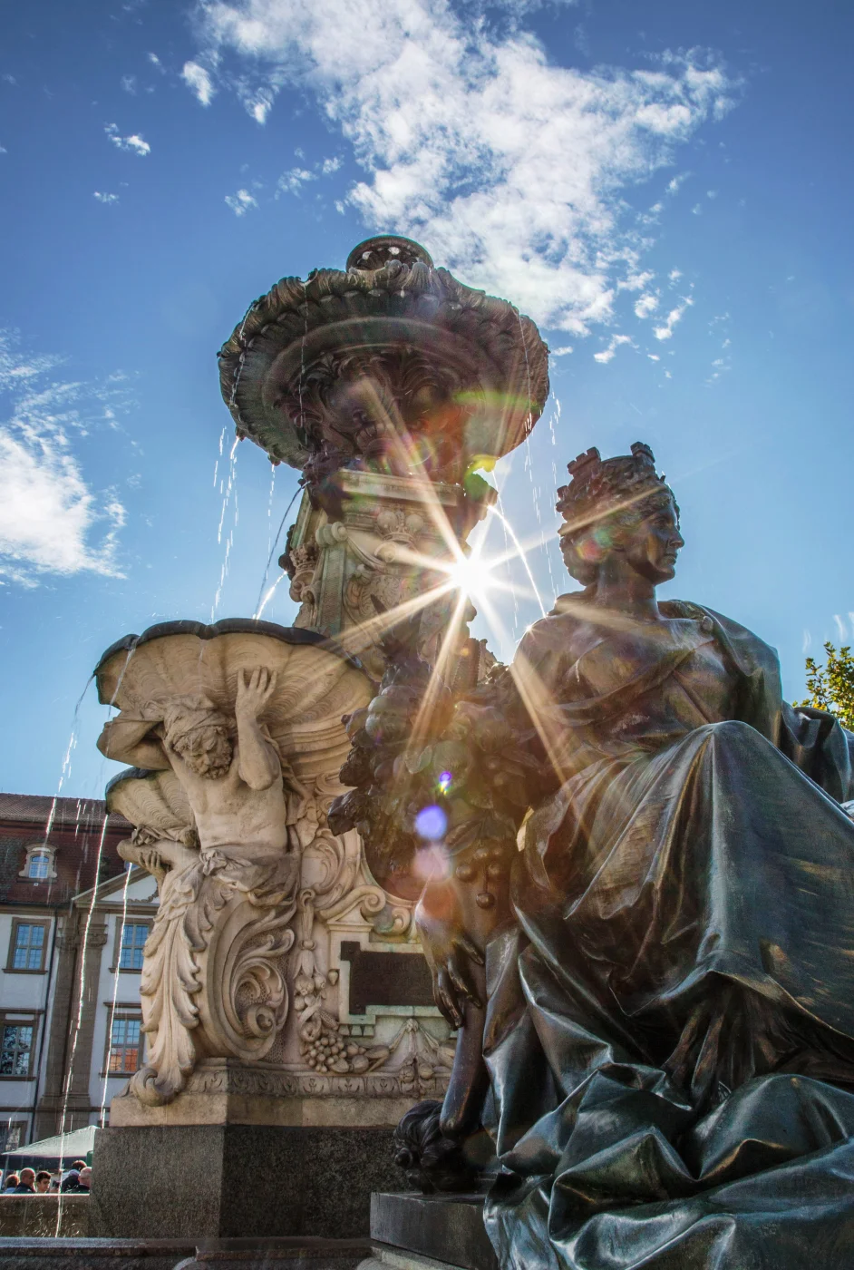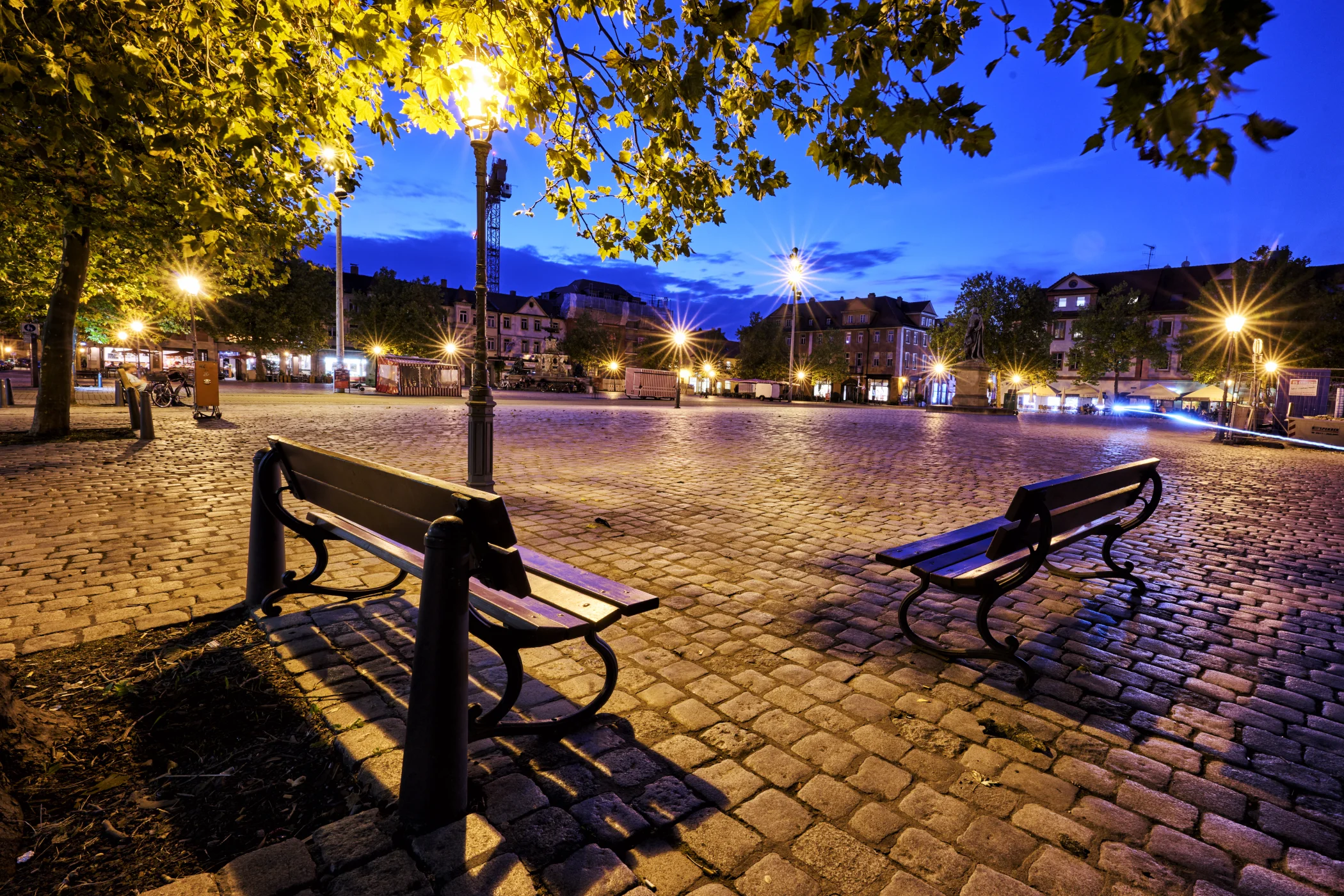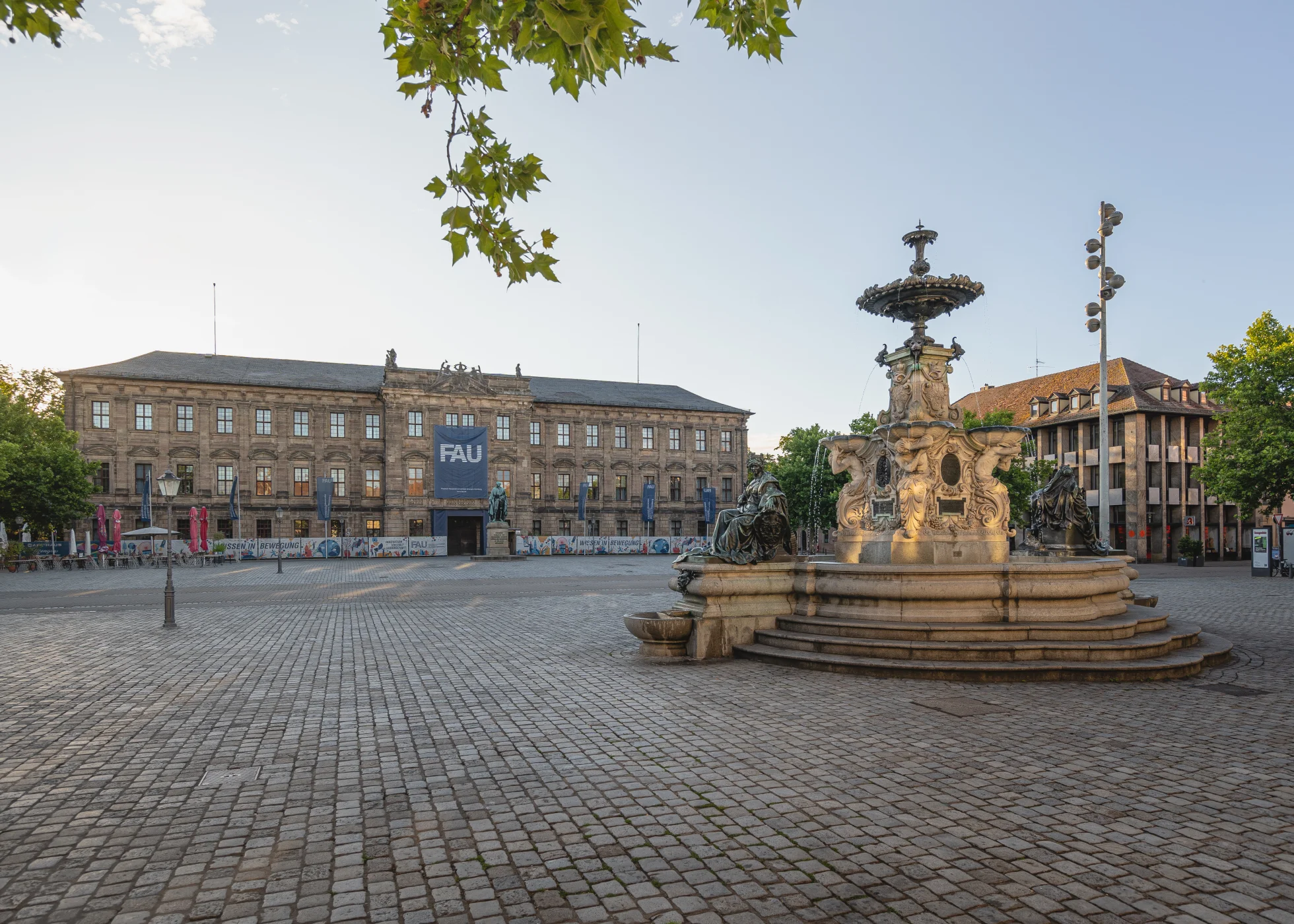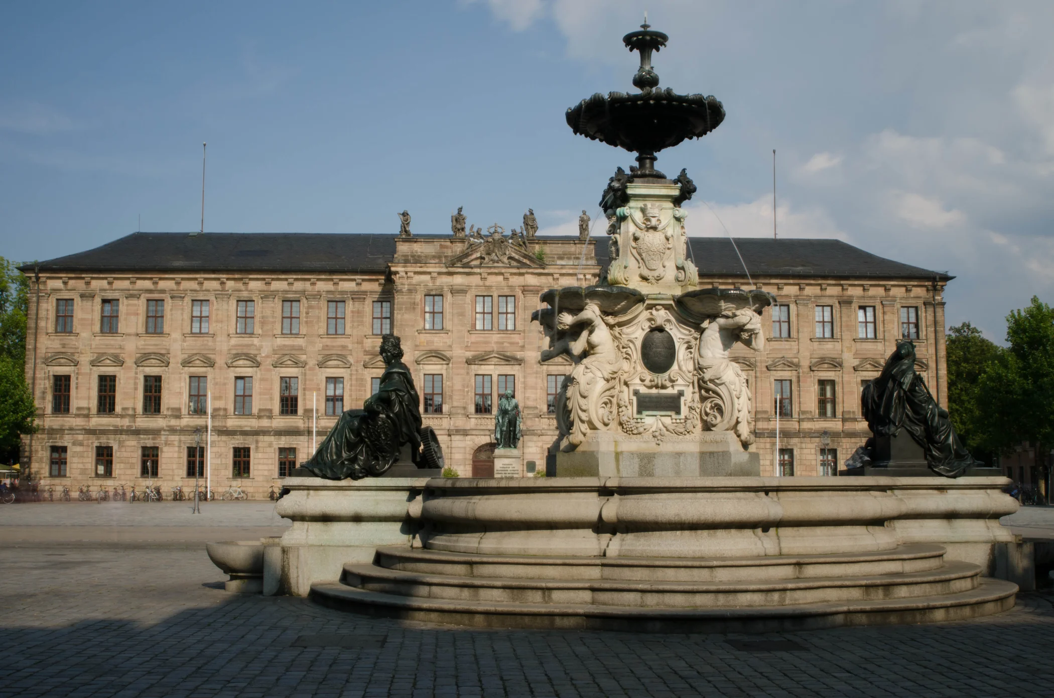 Der Platz beidseitig der Hauptstraße wird im Stadtplan von Johann Moritz Richter als „Grande place“ bezeichnet. Er bildet zusammen mit dem Hugenottenplatz das Zentrum der barocken Neustadt. Nachdem die östliche Seite (39 x 91 m) mit dem Bau des Schlosses als Cour d‘honneur oder Paradeplatz genutzt wurde, bürgerte sich ab 1745 die Bezeichnung Schlossplatz ein. Das Denkmal in der Mitte des Platzes, das der Erlanger Universität zum 100-jährigen Jubiläum vom bayerischen König Ludwig I. geschenkt wurde (1843), zeigt den Universitätsgründer Markgraf Friedrich. Zwei in den Boden eingelassene Tafeln erinnern an die Bücherverbrennung von 1933 und den Universitätsmechaniker Erwin Moritz Reiniger. Die Westseite (ebenfalls 39 x 91 m) diente auch nach dem Bau des Schlosses Marktzwecken und erhielt den Namen Marktplatz. Der Brunnen im Stil der Spätrenaissance (Entwurf: Friedrich Wanderer) wurde 1889 vom Kaufmannsehepaar Pauli gestiftet.