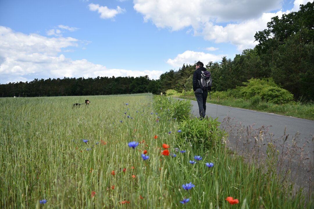 Den „Langen Johann“ Alterlangens im Rücken und im Landschaftsschutzgebiet angekommen, leitet die Starttafel in den Naturerlebnispfad ein. Ein erster Blick geht in die weite Talaue bis hinüber zum Burgberg. Entlang des Zauns des Wasserschutzkerngebiets erreicht der Wanderweg die „fränkische Wüste“, in der nur Spezialisten wie das Silbergras überleben. Hier lohnt ein Blick auf den spärlich bewachsenen Sandboden, aber auch die mit Misteln gespickten Kiefernkronen. Inmitten der Sandäcker ragt ein Holzgerüst mit Baumstamm-Schaukeln auf – eine Tafel erklärt hier das Wesen von Bienen, Wespen und Bienenwölfen, die sich als Räuber und Sandbändiger hervortun. Eine Station weiter ist über die rundherum blühenden Ackerwildkräuter zu lesen. Durch den „Steckeleswald“ schlängelt sich inmitten rotbrauner Spiegelrinden ein schmaler Waldpfad von Tafel zu Tafel, und man lernt mehr über die hiesigen kulturhistorischen Entwicklungen. Im Bereich von Station 5 ist es möglich, die Route zu halbieren und eine Abkürzung zu nehmen. Nur dort trifft man auf Tafel 15 mit Infos zum spannenden Jagdverhalten von Ameisenlöwen. Wer die Augen offen hält, kann ihre Trichter im Sand erspähen. Aber auch Eidechsen, Purpurspanner und die Meisterin der Tarnung, die blauflügelige Ödlandschrecke, leben hier im Sand. Durch Roteichendickicht hindurch, erreicht der Weg eine Tierweitsprunggrube und einen Sitzkreis aus Baumstämmen, der zum Verweilen einlädt und das wichtige Thema Totholz für Tiere aufgreift. Schließlich weitet sich der Blick auf eine große Lichtung, Lebensraum für Kaninchen und Ameisen, die hier als Gärtner und Höhlenbauer fungieren. Unweit des Main-Donau-Kanals und eines Brunnens erreicht man erst ausgedehnte Sandmagerrasen mit speziell angepassten Arten an diese sandigen, nährstoffarmen und trockenen Böden und später leuchtende Klatschmohnfelder. Wer Glück hat, kann sogar die rot ausgekleideten Brutröhren der Mohnbiene im Sand entdecken. Knorrige Kiefern und Spechthöhlen säumen den Weg, der zum zweiten Startpunkt der Tour am Ortseingang von Möhrendorf leitet – auch hier thront ein Startschild mit Flyerkasten neben einem von auf der Tour zahlreichen Insektenhotels. Wer Lust auf ein Eis hat, findet ganz in der Nähe einen kleinen Straßenkiosk zwischen dem kleinen Sport- und dem Wanderparkplatz. Die autofreie Straße teilt eingesäte Wildbienenweiden und weitere Sandmagerrasen, auf denen man das Zirpen der Feldgrillen in ihren Erdlöchern vernehmen oder über Nutzpflanzen lesen kann. Auf einer interaktiven Tafel verstecken sich Bewohner des Lebensraums Schilf, bevor die Tour in die Regnitzaue hinabsteigt. An der Wegkreuzung mit Rastbank und Wildblumenwiese bieten sich verschiedene Möglichkeiten: Wer besonders lecker einkehren möchte, wählt den (unmarkierten) Weg nach Norden zum Weiler Oberndorf mit einstigem Rittergut (Herrenhaus von 1796) am Oberndorfer Weiher; es lohnt aber auch ein Abstecher zu Station 11 – dem historischen Bauernrad, das traditionell zur Bewässerung der Wiesen genutzt wurde. Schnurgerade geht es weiter durch die weite Flur an Heckenstrukturen entlang. Man erfährt über die gefluteten Wässerwiesen und das von der Eiszeit geformte und vom Menschen geprägte Regnitztal, während man in der Ferne ein modernes, elektrisches Bewässerungs-Pumphäuschen am Fluss nahe des Erlanger Klärwerks erblickt. Inmitten wogender Felder steht Tafel 14 mit Erläuterungen zur Landwirtschaft der Talaue. Ein weiterer kleiner Abstecher lohnt sich – er bringt einen durch eine einmalige, verwunschene Heckenlandschaft zum Wald der Zukunft und zur Schwarzbauerngrube, einem Altwasser (ehemalige Flussschleife) der Regnitz mit zahlreichen Spuren des Bibers, riesigen knorrigen Eichen und Pappeln und Wissenswertem zu Hart- und Weichholzauen. Auf Wiesenpfaden geht es zurück am Erlegraben unterhalb der Eichenhutung entlang. Die letzten Stationen erzählen über geologische Entstehungsprozesse des Tals und die Bedeutung des Wassers; passend dazu kann man unterhalb des Wasserwerks auch einen Pumpbrunnen mit Teststationen ausprobieren. Duftende Robinien bringen einen zurück zum Erlenbruch mit Schilfbeständen, die auf hoch anstehendes Grundwasser in der lehmigen, feuchten Talaue hindeuten und zur Wasserreinigung beitragen. Der Blick auf die Erlanger Stadtkirchen macht deutlich, wie zentrumsnah dieses Naturparadies ist.